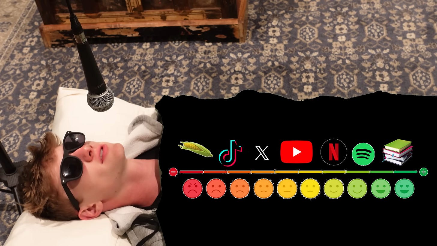 На изображението виждаме скала на носителите, които е важно да избягваме. Най-червени са порнографията и шортовете. След тях, в жълто, са останалите сайтове, които предлагат съдържание чрез алгоритъм —Facebook, X, Youtube и т.н. По-малко ужасни са Netflix и Spotify, които също ползват алгоритми, но имат по-малка тежест при избора ни. И най-подходящи са носители от праисторическото време — като книги и посещения на концерти, театри и може би кина.
